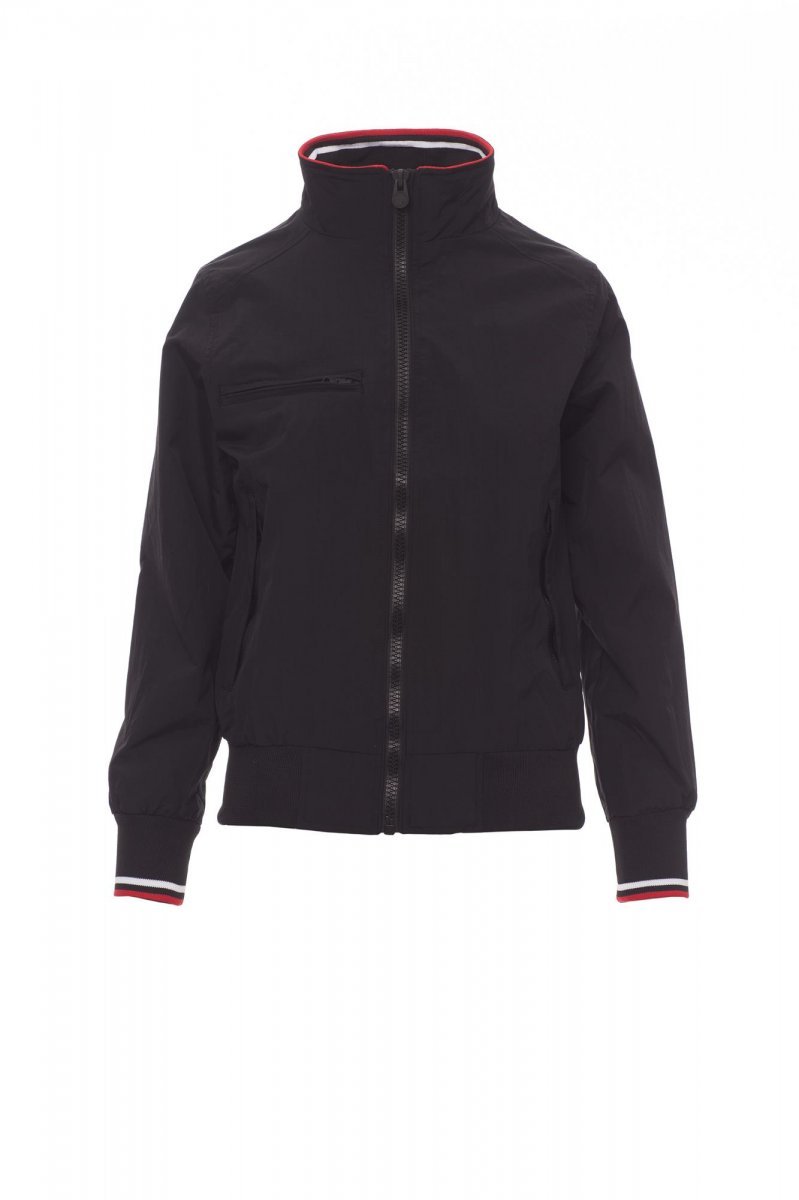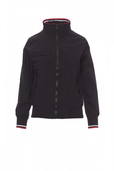 Damska kurtka ergonomiczna, zamek błyskawiczny 8 mm, plastikowy z metalowym suwakiem, z kołnierzem, z elastycznym ściągaczem w talii i u dołu rękawów z paskami, dwie kieszenie zewnętrzne z plastikowym zamkiem błyskawicznym. Od wewnątrz nieocieplona, z podszewką siatkową, kieszonka na smartfon zapinana na zamek błyskawiczny z miejscem na kabel, zamek błyskawiczny na piersi i na plecach ułatwiający tworzenie nadruków i haftów.
