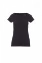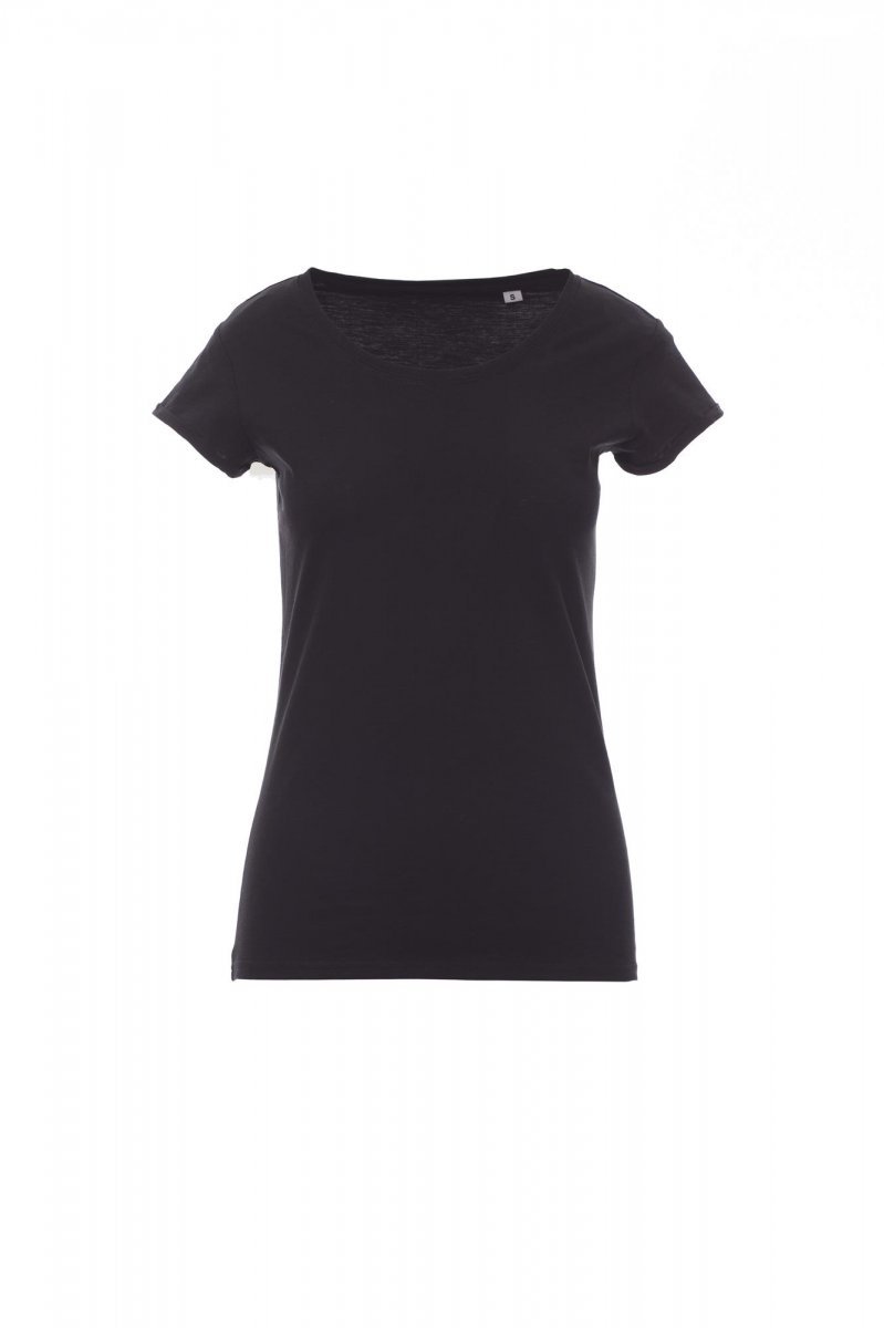 T-shirt damski dopasowany z krótkim rękawem, dekolt głęboki, wykończenie dekoltu taśmą 1 cm z dodatkiem spandeksu, rękawy krótkie z wąskim wywinięciem bez obrębienia, z podwójnymi przeszyciami wewnętrznymi na barkach, rękawy z wąskim wywinięciem bez obrębienia, szwy boczne, bez etykiety