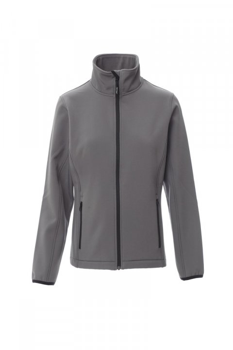 Damski 2-warstwowy soft-shell z hydrofobową impregnacją, wszywanymi rękawami, zapinany na wykończony taśmą zamek błyskawiczny SBS. Mankiety z wąską ściągającą lamówką. Dwie boczne kieszenie zapinane na zamek błyskawiczny.