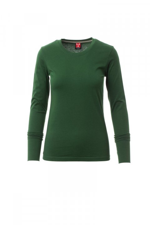 T-shirt z długim rękawem damski, dekolt okrągły, z wykończeniem dekoltu w postaci taśmy 1,5 cm ściągacza z dodatkiem spandeksu, obszycie wierzchnie z przodu, długi mankiet, kontrastująca taśma wzmacniająca na całej szerokości barków, widoczna na spodniej części kołnierzyka, szwy elastyczne, szwy na bokach