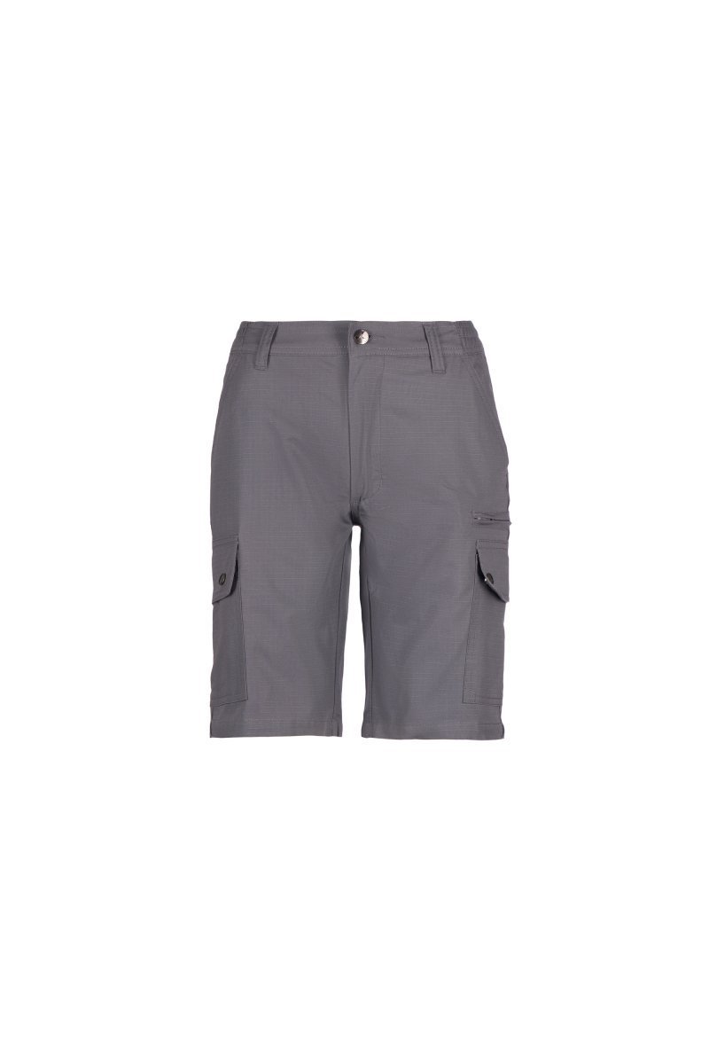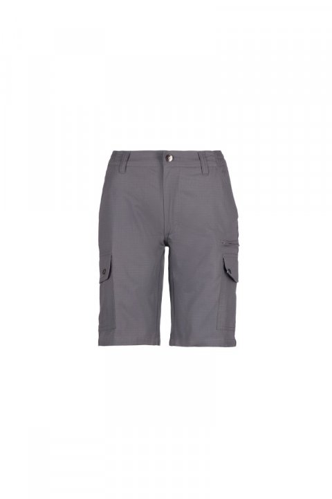 Spodnie bermudy damskie, gumki z boku i szlufki w talii, zapinane na zamek i guzik z metalu, z przodu dwie kieszenie o kroju klasycznym, dwie kieszenie boczne z patką i zatrzaskiem, z lewej strony kieszeń zamykana na zamek, z prawej wpuszczana kieszeń na taśmę mierniczą, z tyłu dwie wpuszczane kieszenie z pętelką i guzikiem.