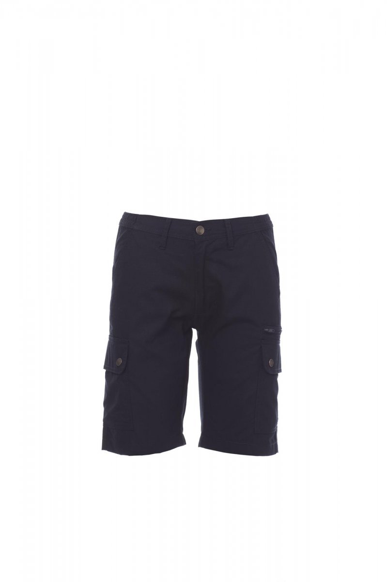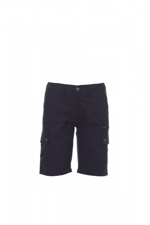 Spodnie bermudy damskie, gumki z boku i szlufki w talii, zapinane na zamek i guzik z metalu, z przodu dwie kieszenie o kroju klasycznym, dwie kieszenie boczne z patką i zatrzaskiem, z lewej strony kieszeń zamykana na zamek, z prawej wpuszczana kieszeń na taśmę mierniczą, z tyłu dwie wpuszczane kieszenie z pętelką i guzikiem.