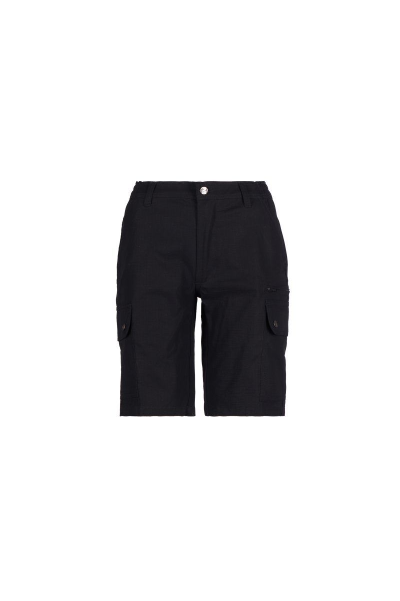 Spodnie bermudy damskie, gumki z boku i szlufki w talii, zapinane na zamek i guzik z metalu, z przodu dwie kieszenie o kroju klasycznym, dwie kieszenie boczne z patką i zatrzaskiem, z lewej strony kieszeń zamykana na zamek, z prawej wpuszczana kieszeń na taśmę mierniczą, z tyłu dwie wpuszczane kieszenie z pętelką i guzikiem.