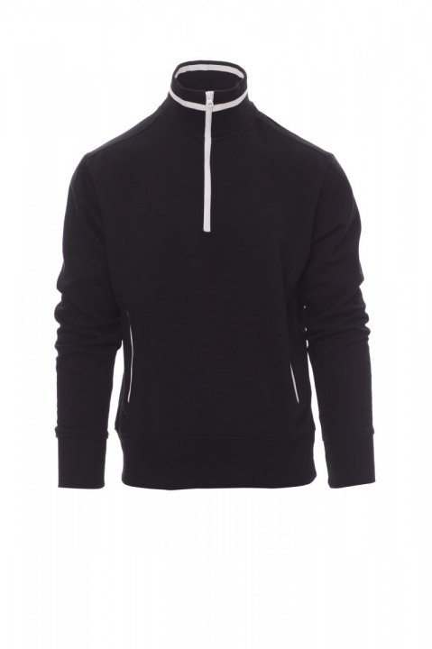 Bluza męska z krótkim plastikowym zamkiem błyskawicznym w kontrastowym kolorze, z metalowym suwakiem, kontrastowe wykończenie kołnierzyka i kieszeni bocznych. Dopasowane rękawy, elastyczny ściągacz w talii i na mankietach, wzmocnione szwy.