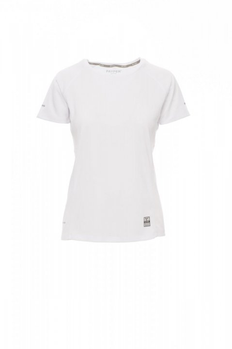 Dopasowany t-shirt damski techniczny/sportowy z rękawami raglanowymi, podwójne szwy boczne zapewniające lepsze dopasowanie, dół profilowany z dłuższym tyłem, odblaskowe wstawki na rękawach i tylnej części kołnierzyka, taśma w obszyciu wewnętrznym kołnierzyka w kontrastowym kolorze, etykieta termotransferowa.