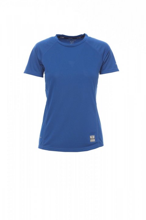 Dopasowany t-shirt damski techniczny/sportowy z rękawami raglanowymi, podwójne szwy boczne zapewniające lepsze dopasowanie, dół profilowany z dłuższym tyłem, odblaskowe wstawki na rękawach i tylnej części kołnierzyka, taśma w obszyciu wewnętrznym kołnierzyka w kontrastowym kolorze, etykieta termotransferowa.