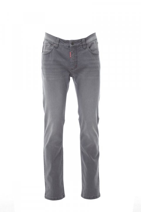 Spodnie męskie o kroju dżinsów z pięcioma kieszeniami, zapinane na metalowy zamek błyskawiczny i guzik, szlufki w talii, 1 chowana kieszeń na taśmę mierniczą, 1 kieszonka na długopisy i przecinacz, obróbka typu stone wash, efekt zużycia i sprania. Nogawki rurki, grube kontrastowe trzyrzędowe szwy wewnątrz nogawek. Gramatura tkaniny: 10,50oz/yd².