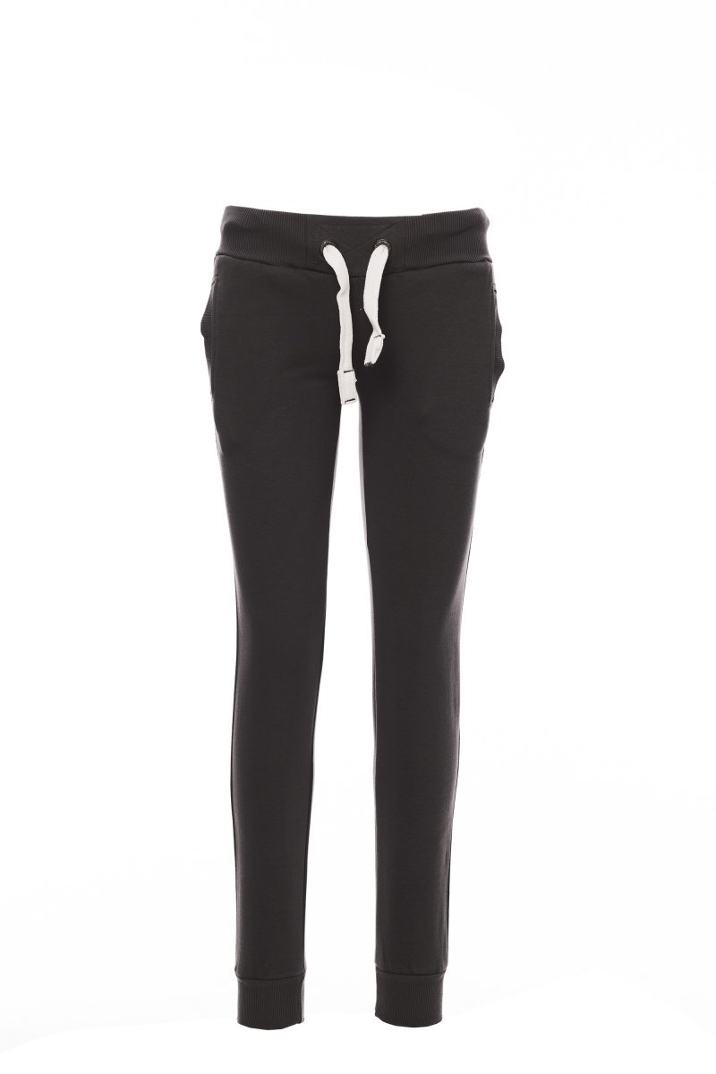 Spodnie dresowe damskie ze ściągaczem w pasie i u dołu nogawek, sznurek biały z kontrastowymi przeszyciami i kółkami metalowymi, dwie kieszenie z przodu ze ściągaczem, wzmocnione szwy.
