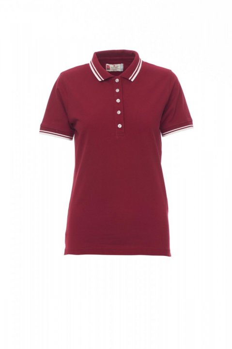 Koszulka polo damska, dopasowana, z krótkim rękawem, 5 białych guzików, eleganckie kontrastowe wykończenie kołnierzyka i rękawów, kołnierzyk i krawędź rękawa ze ściągaczem, rozcięcia boczne ze wzmocnionymi szwami, zasłonięte szwy na kołnierzyku, boczna taśma wzmacniająca, szwy elastyczne, taśma w obszyciu wewnętrznym kołnierzyka.