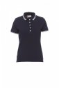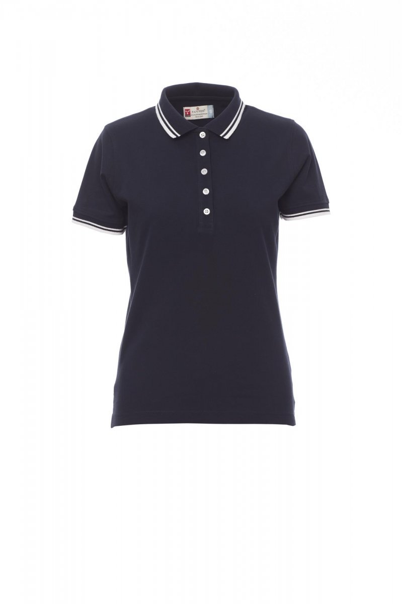 Koszulka polo damska, dopasowana, z krótkim rękawem, 5 białych guzików, eleganckie kontrastowe wykończenie kołnierzyka i rękawów, kołnierzyk i krawędź rękawa ze ściągaczem, rozcięcia boczne ze wzmocnionymi szwami, zasłonięte szwy na kołnierzyku, boczna taśma wzmacniająca, szwy elastyczne, taśma w obszyciu wewnętrznym kołnierzyka.