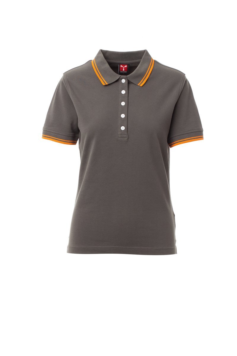Koszulka polo damska, dopasowana, z krótkim rękawem, 5 białych guzików, eleganckie kontrastowe wykończenie kołnierzyka i rękawów, kołnierzyk i krawędź rękawa ze ściągaczem, rozcięcia boczne ze wzmocnionymi szwami, zasłonięte szwy na kołnierzyku, boczna taśma wzmacniająca, szwy elastyczne, taśma w obszyciu wewnętrznym kołnierzyka.