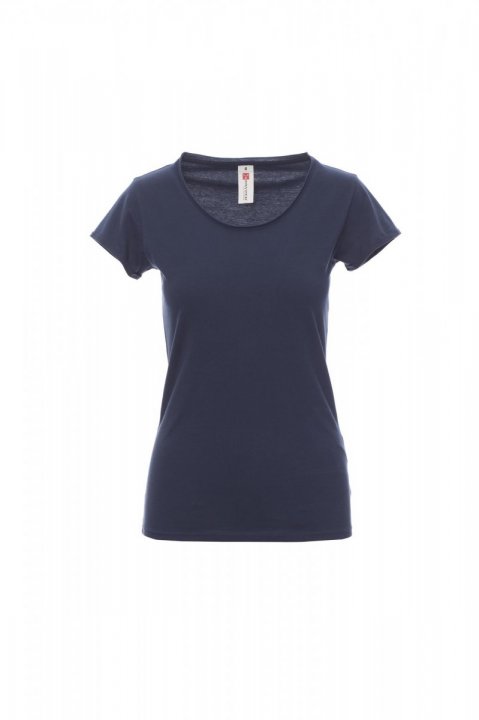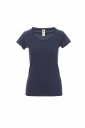 Dopasowany T-shirt damski z krótkim rękawem i pogłębionym dekoltem, z 1 cm brzegiem bez obrębienia, ramiona z podwójnymi przeszyciami wewnętrznymi, krótkie rękawy z wąskim wywinięciem bez obrębienia, boczne szwy.