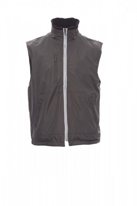 Kamizelka unisex dwustronna, plastikowy zamek błyskawiczny z zakładkami odblaskowymi, troczek w talii, trzy zewnętrzne kieszenie. Wnętrze z polaru, kołnierz ze ściągaczem z dzianiny, dwie kieszenie i zamek błyskawiczny na piersi ułatwiający tworzenie nadruków i haftów.