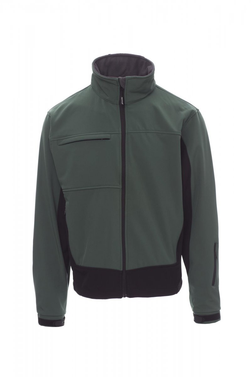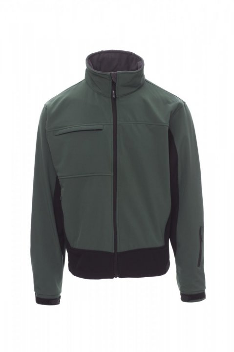 WP 8000 mm H₂O, WVT 5000 g/m² 24h. Męski 3-warstwowy soft-shell, dwukolorowy. Zapinany na wykończony taśmą zamek błyskawiczny SBS i z kapturem chowanym w kołnierzu. Mankiety regulowane gumowanymi paskami na nadgarstek i rzepem. Dwie boczne kieszenie zapinane na zamek błyskawiczny, jedna kieszeń na piersi z chowanym uchwytem na identyfikator, jedna kieszeń na karnet narciarski na ramieniu, talia regulowana ściąganym sznurkiem.