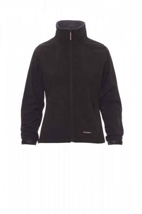WP 8000 mm H₂O, WVT 5000 g/m² 24h. Damski 3-warstwowy soft-shell zapinany na wykończony taśmą zamek błyskawiczny SBS. Mankiety regulowane gumowanymi paskami na nadgarstek i rzepem. Dwie boczne kieszenie zapinane na zamek błyskawiczny, jedna kieszeń na karnet narciarski na ramieniu.