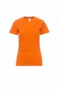 T-shirt z krótkim rękawem damski, dopasowany, dekolt okrągły, z wykończeniem dekoltu w postaci taśmy 1,5 cm ściągacza z dodatkiem spandeksu, obszycie wierzchnie z przodu, kontrastująca taśma wzmacniająca na całej szerokości barków, widoczna na spodniej części kołnierzyka, szwy elastyczne, szwy na bokach