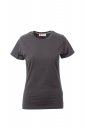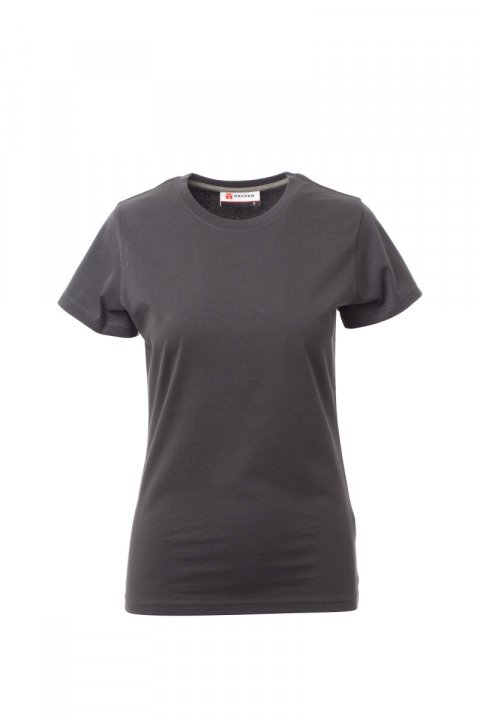 T-shirt z krótkim rękawem damski, dopasowany, dekolt okrągły, z wykończeniem dekoltu w postaci taśmy 1,5 cm ściągacza z dodatkiem spandeksu, obszycie wierzchnie z przodu, kontrastująca taśma wzmacniająca na całej szerokości barków, widoczna na spodniej części kołnierzyka, szwy elastyczne, szwy na bokach