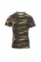 T-shirt z krótkim rękawem męski, dekolt okrągły, z wykończeniem dekoltu w postaci taśmy 1,5 cm ściągacza z dodatkiem spandeksu, obszycie wierzchnie z przodu, kontrastująca taśma wzmacniająca na całej szerokości barków, widoczna na spodniej części kołnierzyka, szwy elastyczne, wzór typu tuba (wersja maskująca ze szwami bocznymi)