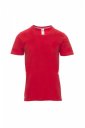 T-shirt z krótkim rękawem męski, dekolt w serek, z wykończeniem dekoltu w postaci taśmy 1,5 cm ściągacza z dodatkiem spandeksu, obszycie wierzchnie z przodu, kontrastująca taśma wzmacniająca na całej szerokości barków, widoczna na spodniej części kołnierzyka, szwy elastyczne, wzór typu tuba.