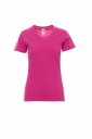 T-shirt damski dopasowany, dekolt w serek, z wykończeniem dekoltu w postaci taśmy 1,5 cm ściągacza z dodatkiem spandeksu, obszycie wierzchnie z przodu, kontrastująca taśma wzmacniająca na całej szerokości barków, widoczna na spodniej części kołnierzyka, szwy elastyczne, szwy na bokach
