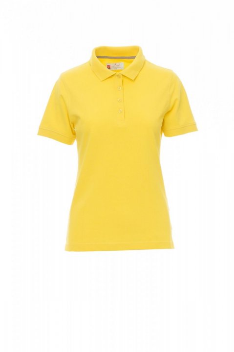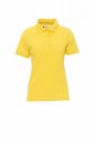 Koszulka polo damska, dopasowana, z krótkim rękawem, z 4 pasującymi guzikami z efektem masy perłowej, kołnierzyk i krawędzie rękawów ze ściągaczem, rozcięcia boczne, zasłonięte szwy kołnierzyka z kontrastową taśmą, szwy elastyczne, boczna taśma wzmacniająca, taśma w obszyciu wewnętrznym kołnierzyka