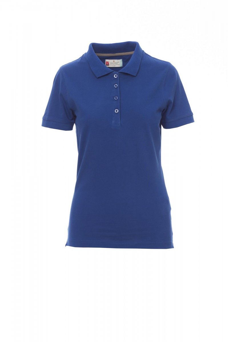 Koszulka polo damska, dopasowana, z krótkim rękawem, z 4 pasującymi guzikami z efektem masy perłowej, kołnierzyk i krawędzie rękawów ze ściągaczem, rozcięcia boczne, zasłonięte szwy kołnierzyka z kontrastową taśmą, szwy elastyczne, boczna taśma wzmacniająca, taśma w obszyciu wewnętrznym kołnierzyka