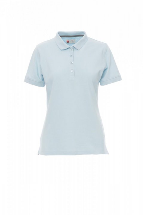 Koszulka polo damska, dopasowana, z krótkim rękawem, z 4 pasującymi guzikami z efektem masy perłowej, kołnierzyk i krawędzie rękawów ze ściągaczem, rozcięcia boczne, zasłonięte szwy kołnierzyka z kontrastową taśmą, szwy elastyczne, boczna taśma wzmacniająca, taśma w obszyciu wewnętrznym kołnierzyka