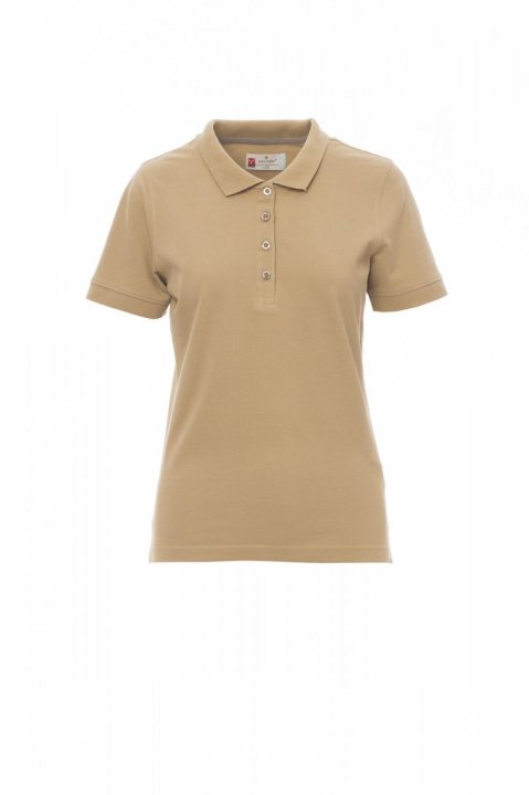 Koszulka polo damska, dopasowana, z krótkim rękawem, z 4 pasującymi guzikami z efektem masy perłowej, kołnierzyk i krawędzie rękawów ze ściągaczem, rozcięcia boczne, zasłonięte szwy kołnierzyka z kontrastową taśmą, szwy elastyczne, boczna taśma wzmacniająca, taśma w obszyciu wewnętrznym kołnierzyka