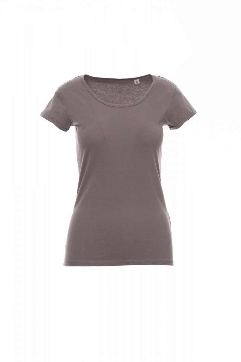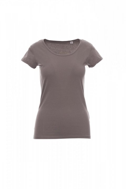 T-shirt damski dopasowany z krótkim rękawem, dekolt lekko pogłębiony, wykończenie dekoltu wąską taśmą, rękawy z wąskim wywinięciem bez obrębienia, szwy boczne