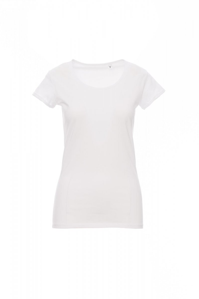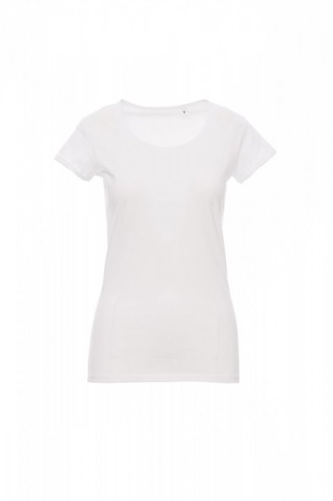 T-shirt damski dopasowany z krótkim rękawem, dekolt lekko pogłębiony, wykończenie dekoltu wąską taśmą, rękawy z wąskim wywinięciem bez obrębienia, szwy boczne
