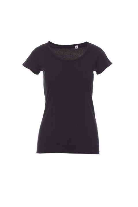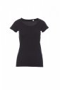 T-shirt damski dopasowany z krótkim rękawem, dekolt lekko pogłębiony, wykończenie dekoltu wąską taśmą, rękawy z wąskim wywinięciem bez obrębienia, szwy boczne