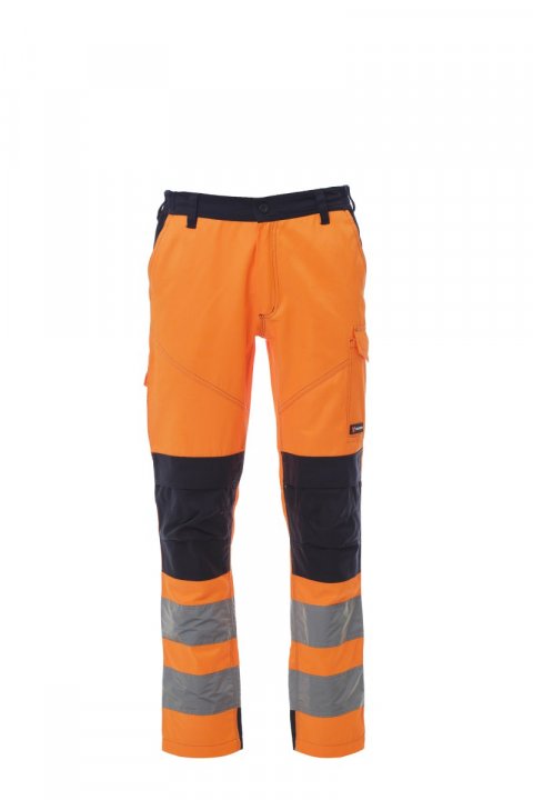 Spodnie męskie z kieszeniami na nakolanniki, całoroczne, o wysokiej widzialności z paskami odblaskowymi, gumki z boku i szlufki w talii, zapinane na zamek błyskawiczny i guzik z tworzywa sztucznego, z przodu dwie kieszenie o kroju klasycznym, jedna kieszeń boczna z zapięciem LOCK SYSTEM, kieszeń na taśmę mierniczą, kieszeń na telefon, z tyłu dwie kieszenie, z których jedna otwarta z paskami odblaskowymi, a druga zamknięta na klapkę i na rzep. Kontrastowe przeszycia, krok i wewnętrzna część nogawki z trzyrzędowym szwem.