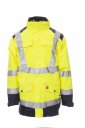Dwukolorowa parka 4w1 o wysokiej widoczności z pasami odblaskowymi. Kurtka zewnętrzna bez podszewki, plastikowy otwór na zamek błyskawiczny z metalowym suwakiem przykryty klapką i rzepem, kaptur z odpinanym i/lub wiązanym sznurkiem w kołnierzu, regulowane elastyczne mankiety. 4 kieszenie przednie: na prawej piersi z rzepem, uchwytem na długopis i ukrytym uchwytem na identyfikator; po lewej stronie na zamek błyskawiczny; 2 dolne kieszenie na zamek błyskawiczny i zatrzask oraz z bocznym otwarciem. Zgrzewane szwy. Wyściełana kurtka wewnętrzna z odpinanymi rękawami, plastikowy zamek błyskawiczny z metalowym suwakiem, elastyczne mankiety. 4 przednie kieszenie: na lewej piersi na rzep, uchwyt na długopis i chowany uchwyt na identyfikator; po lewej stronie na zamek błyskawiczny; 2 dolne kieszenie na rzep. Na obu: kołnierz i ramiona z mikropolaru, zamek błyskawiczny ułatwiający tworzenie nadruków i haftów, dwie opaski na klatce piersiowej, ramionach i rękawach.
