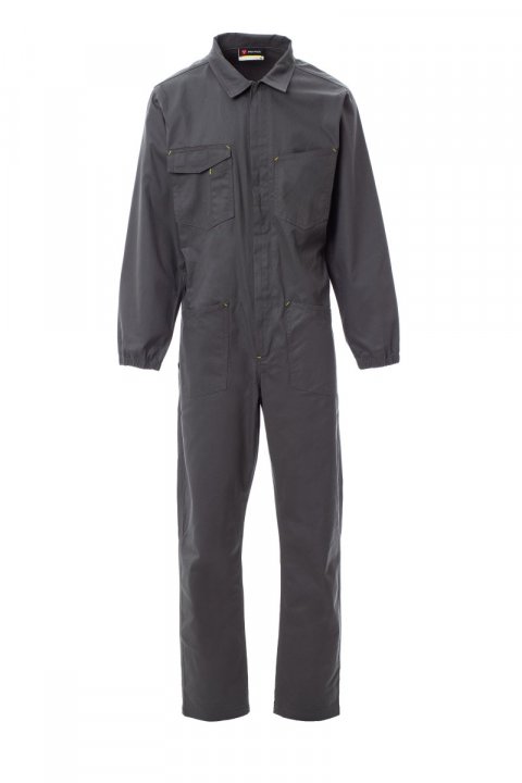 Kombinezon zapinany na zakryty zamek błyskawiczny z podwójnym suwakiem, umieszczony w centralnej części, gumka na mankietach i z tyłu w pasie. Dwie naszyte kieszenie, dwie kieszenie na klatce piersiowej, z czego jedna na smartfon, uchwyt na identyfikator, z miejscem na długopis i patką zapinaną na rzep, kieszeń na taśmę mierniczą. Podwójny szew w kroku i po wewnętrznej stronie nogawki.