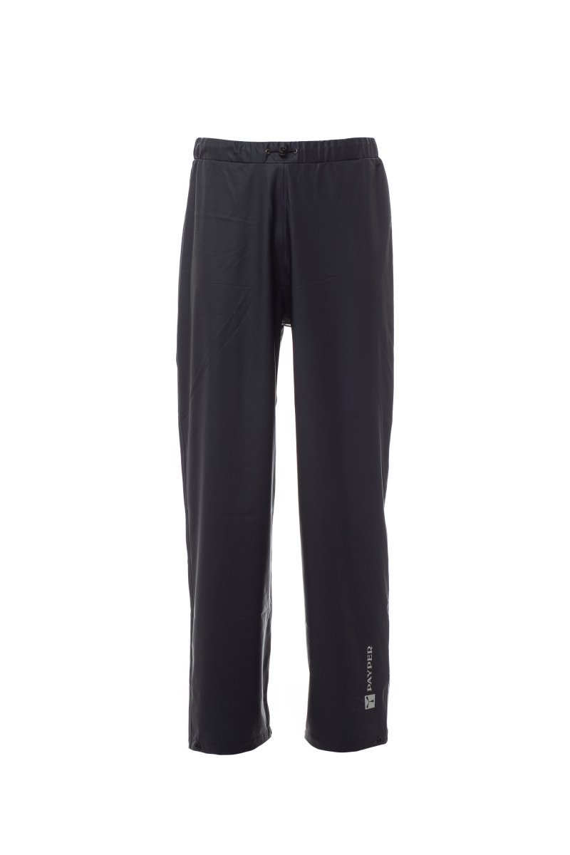 Spodnie przeciwdeszczowe, materiał elastyczny w pasie ze sznurkiem, regulowany dół nogawki z zatrzaskiem, szwy wzmocnione termicznie taśmą.