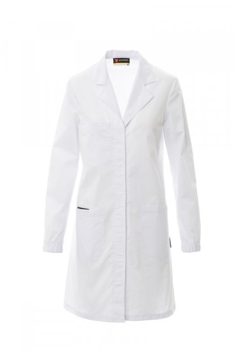 Fartuch damski z kołnierzem z klasycznymi klapami, zapinany z przodu na zatrzaski, kryta plisa guzikowa, jedna kieszeń naszywana na piersi z miejscem na długopis, dwie naszywane kieszenie w pasie, kieszeń na smartfon, gładki karczek z tyłu, rozcięcie z tyłu ułatwiające poruszanie się, długie rękawy z elastycznymi mankietami.