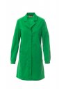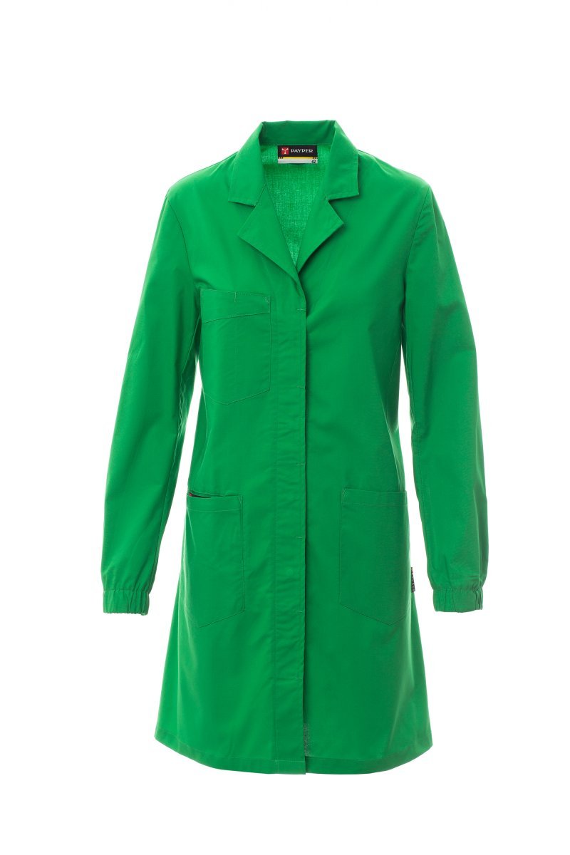 Fartuch damski z kołnierzem z klasycznymi klapami, zapinany z przodu na zatrzaski, kryta plisa guzikowa, jedna kieszeń naszywana na piersi z miejscem na długopis, dwie naszywane kieszenie w pasie, kieszeń na smartfon, gładki karczek z tyłu, rozcięcie z tyłu ułatwiające poruszanie się, długie rękawy z elastycznymi mankietami.