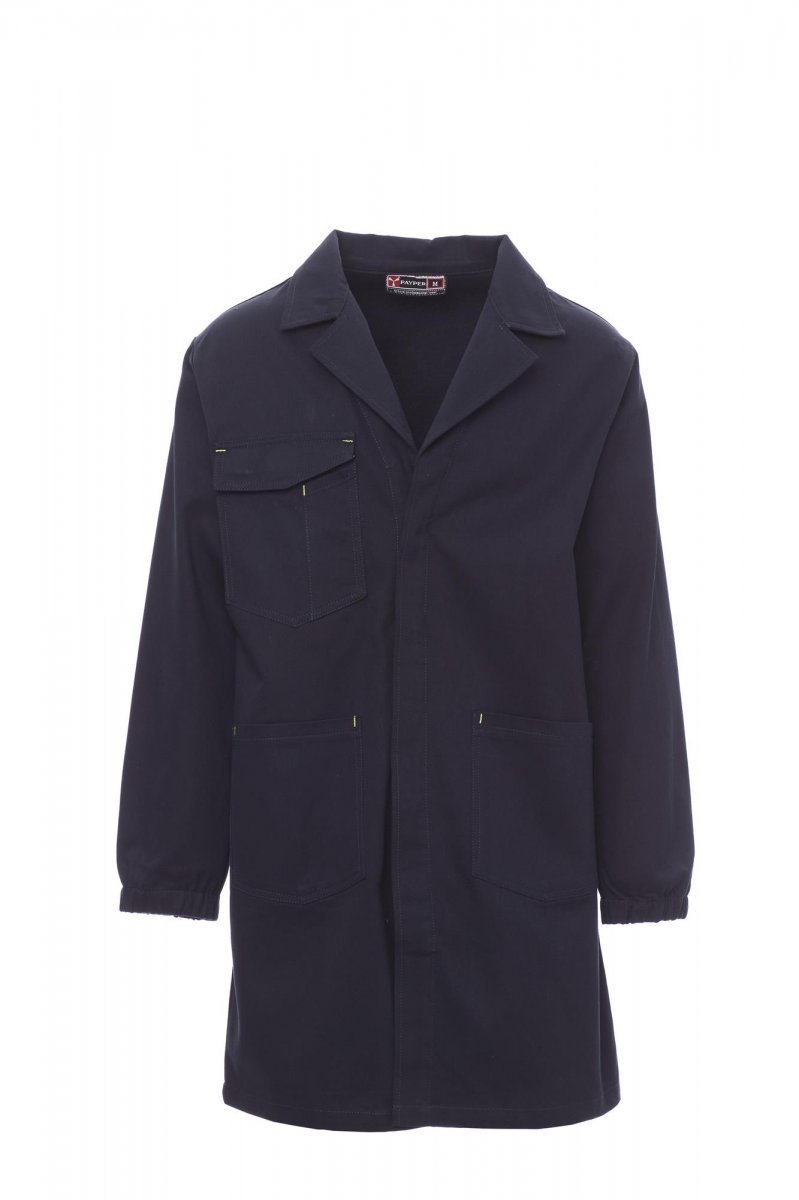 Fartuch z otwartym kołnierzem, rękawy z gumkami, z zakrytym zapięciem na guziki, dwie naszyte kieszenie i jedna kieszeń na klatce piersiowej na telefon, uchwyt na identyfikator, miejsce na długopis z patką zamykaną na rzep.