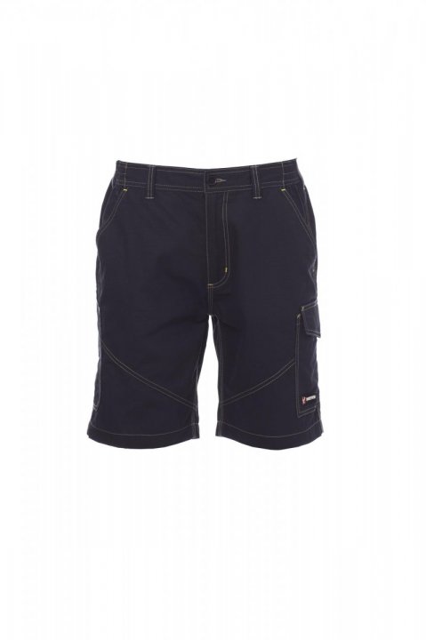 Bermudy męskie, gumki z boku i szlufki w talii, zapinane na zamek i guzik z tworzywa sztucznego, z przodu dwie kieszenie o kroju klasycznym, jedna kieszeń boczna z LOCK SYSTEM, kieszeń na taśmę mierniczą. Z tyłu dwie kieszenie, jedna z patką, a druga otwarta, kontrastowe wstawki i przeszycia, z odblaskowymi paskami na tylnej kieszeni, potrójne szwy.