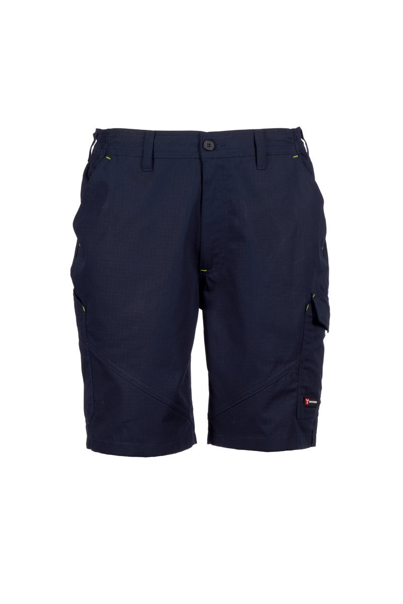 Bermudy męskie, gumki z boku i szlufki w talii, zapinane na zamek i guzik z tworzywa sztucznego, z przodu dwie kieszenie o kroju klasycznym, jedna kieszeń boczna z LOCK SYSTEM, kieszeń na taśmę mierniczą. Z tyłu dwie kieszenie, jedna z patką, a druga otwarta, kontrastowe wstawki i przeszycia, z odblaskowymi paskami na tylnej kieszeni, potrójne szwy.