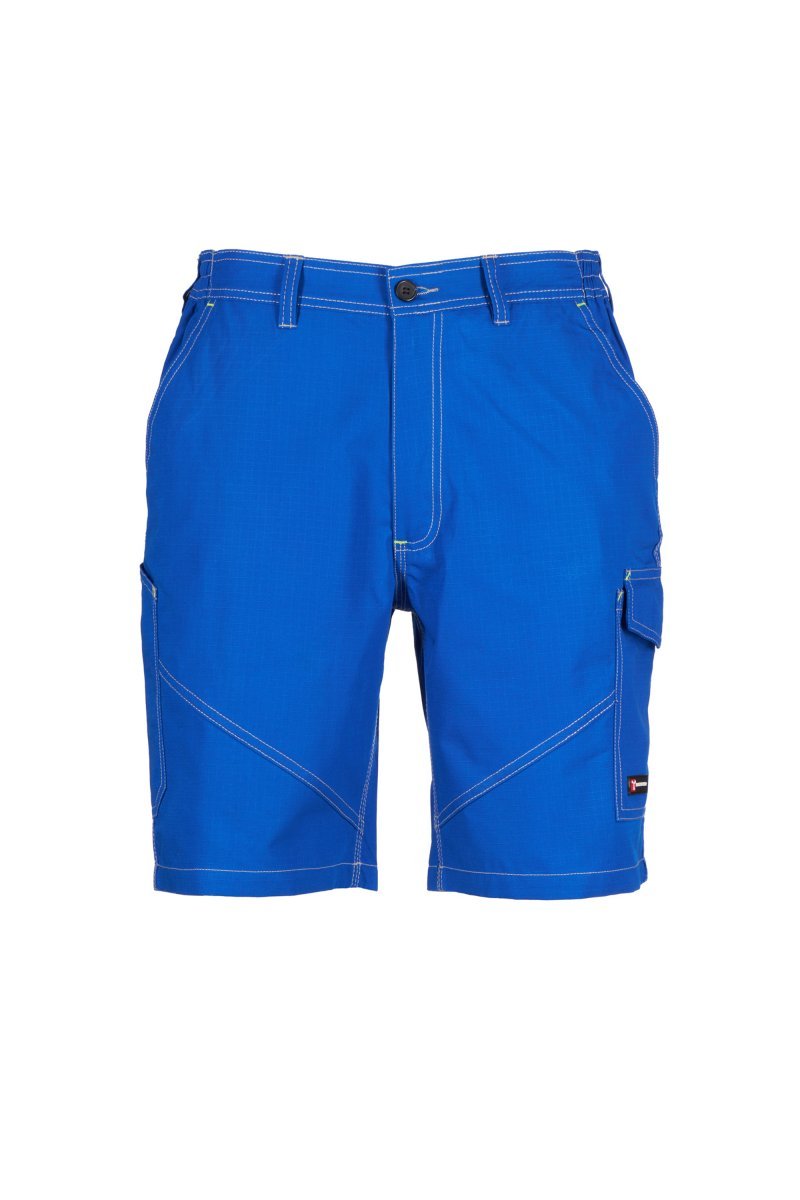 Bermudy męskie, gumki z boku i szlufki w talii, zapinane na zamek i guzik z tworzywa sztucznego, z przodu dwie kieszenie o kroju klasycznym, jedna kieszeń boczna z LOCK SYSTEM, kieszeń na taśmę mierniczą. Z tyłu dwie kieszenie, jedna z patką, a druga otwarta, kontrastowe wstawki i przeszycia, z odblaskowymi paskami na tylnej kieszeni, potrójne szwy.