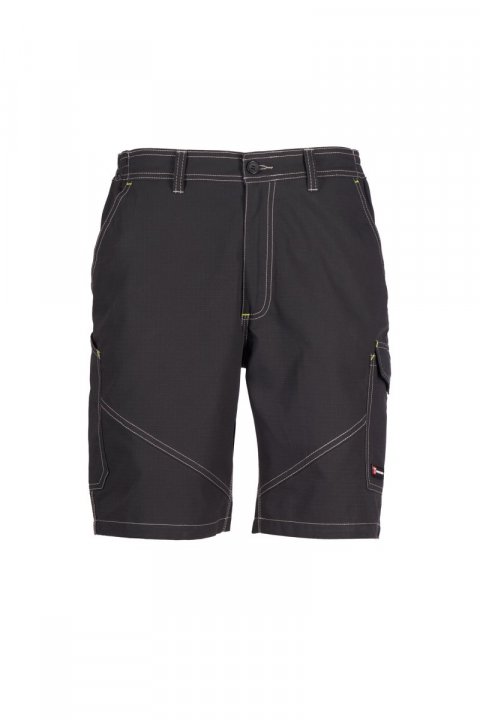Bermudy męskie, gumki z boku i szlufki w talii, zapinane na zamek i guzik z tworzywa sztucznego, z przodu dwie kieszenie o kroju klasycznym, jedna kieszeń boczna z LOCK SYSTEM, kieszeń na taśmę mierniczą. Z tyłu dwie kieszenie, jedna z patką, a druga otwarta, kontrastowe wstawki i przeszycia, z odblaskowymi paskami na tylnej kieszeni, potrójne szwy.
