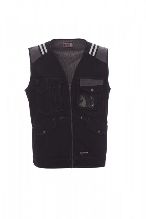 Kamizelka męska w dwóch odcieniach, zapinana z przodu na plastikowy zamek błyskawiczny, w pasie zapinana na guzik, trzy kieszenie z przodu z zapięciem LOCK SYSTEM, dwie wykonane jako kieszenie-kangurki z klapką i guzikiem metalowym, odpinany rozkładany uchwyt na identyfikator, wielofunkcyjna kieszonka na klatce piersiowej. Odblaskowe paski na barkach. Model dopasowany typu dżinsy. Podszewka z membrany dry-tech w kontrastowym kolorze, odpinana w celu ułatwienia wykonywania nadruków i zdobień.