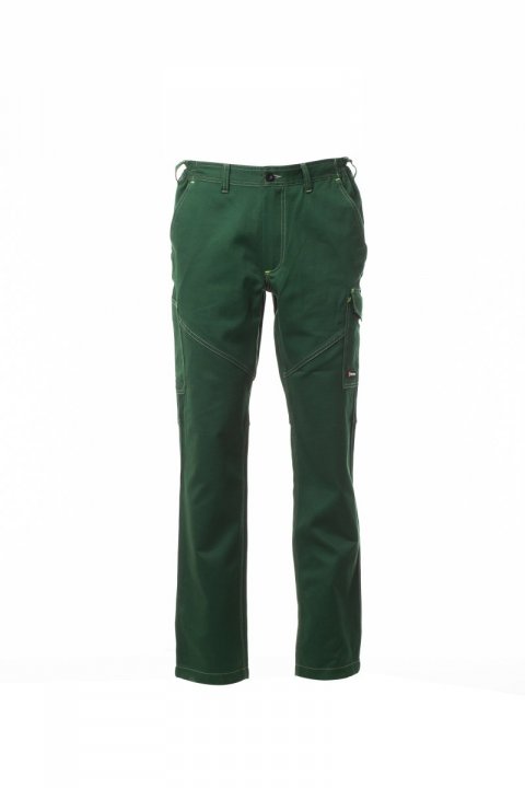 Spodnie całoroczne unisex, z elastycznymi wstawkami bocznymi i szlufkami na pasek. Zapinane na zamek błyskawiczny z guzikiem plastikowym, dwie klasyczne kieszenie przednie, kieszeń boczna z zapięciem LOCK SYSTEM, kieszonka na taśmę mierniczą, dwie kieszenie z tyłu, jedna otwarta, jedna z klapką i zapięciem na rzep, kontrastowe wstawki i przeszycia, z odblaskowymi paskami na tylnej kieszeni, potrójne szwy. Zatrzask dla koloru białego. Szwy i przeszycia pod kolor z kontrastującymi fluorescencyjnymi żółtymi szwami dla koloru pełny niebieski granat.