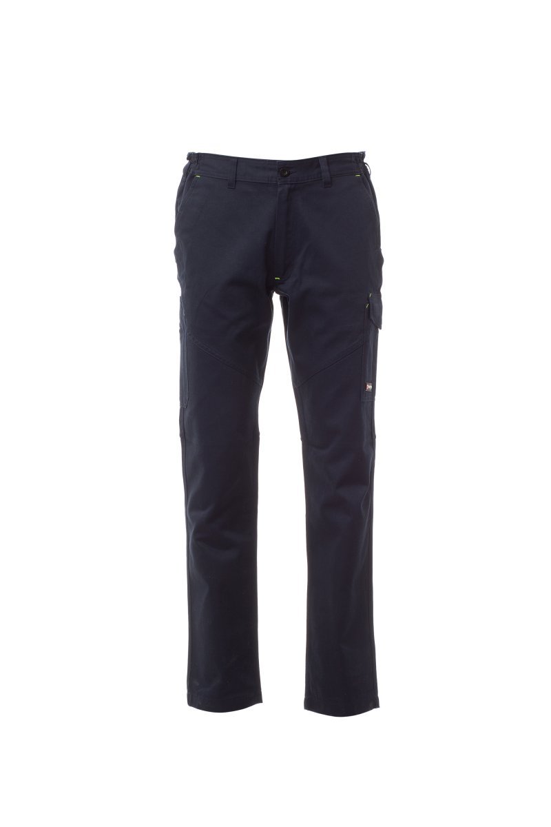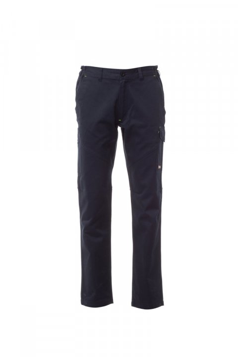 Spodnie całoroczne unisex, z elastycznymi wstawkami bocznymi i szlufkami na pasek. Zapinane na zamek błyskawiczny z guzikiem plastikowym, dwie klasyczne kieszenie przednie, kieszeń boczna z zapięciem LOCK SYSTEM, kieszonka na taśmę mierniczą, dwie kieszenie z tyłu, jedna otwarta, jedna z klapką i zapięciem na rzep, kontrastowe wstawki i przeszycia, z odblaskowymi paskami na tylnej kieszeni, potrójne szwy. Zatrzask dla koloru białego. Szwy i przeszycia pod kolor z kontrastującymi fluorescencyjnymi żółtymi szwami dla koloru pełny niebieski granat.