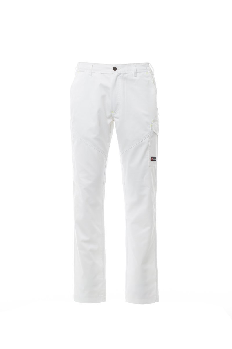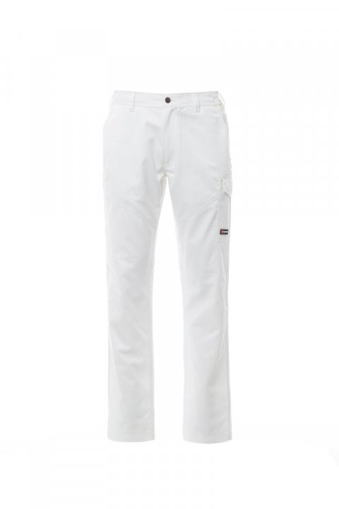 Spodnie unisex, całoroczne, gumki z boku i szlufki w talii, zapinane na zamek i guzik z tworzywa sztucznego, z przodu dwie kieszenie o kroju klasycznym, jedna kieszeń boczna z LOCK SYSTEM, kieszeń na taśmę mierniczą, z tyłu dwie kieszenie: jedna z klapką i na rzep, a druga otwarta, wstawki i przeszycia pod kolor, odblaskowe paski na tylnej kieszeni, potrójne szwy. Zatrzask dla koloru białego.