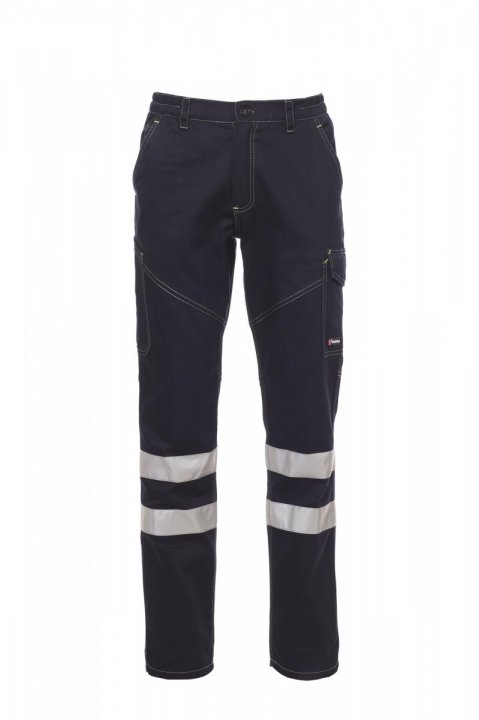 Spodnie unisex, całoroczne, z odblaskowymi paskami kat. 1, gumki z boku i szlufki w talii, zapinane na zamek błyskawiczny i guzik z tworzywa sztucznego, z przodu dwie kieszenie o klasycznym kroju, jedna kieszeń boczna z LOCK SYSTEM, kieszeń na taśmę mierniczą. Z tyłu dwie kieszenie, z których jedna z klapką i rzepem, a druga otwarta, kontrastowe wstawki i przeszycia, odblaskowe paski na tylnej kieszeni, potrójne przeszycia. Szwy i przeszycia pod kolor z kontrastującymi fluorescencyjnymi żółtymi szwami dla koloru Całkiem czarny.