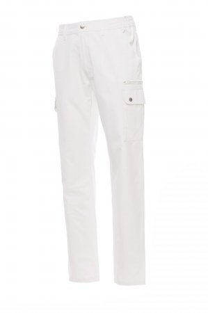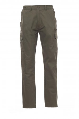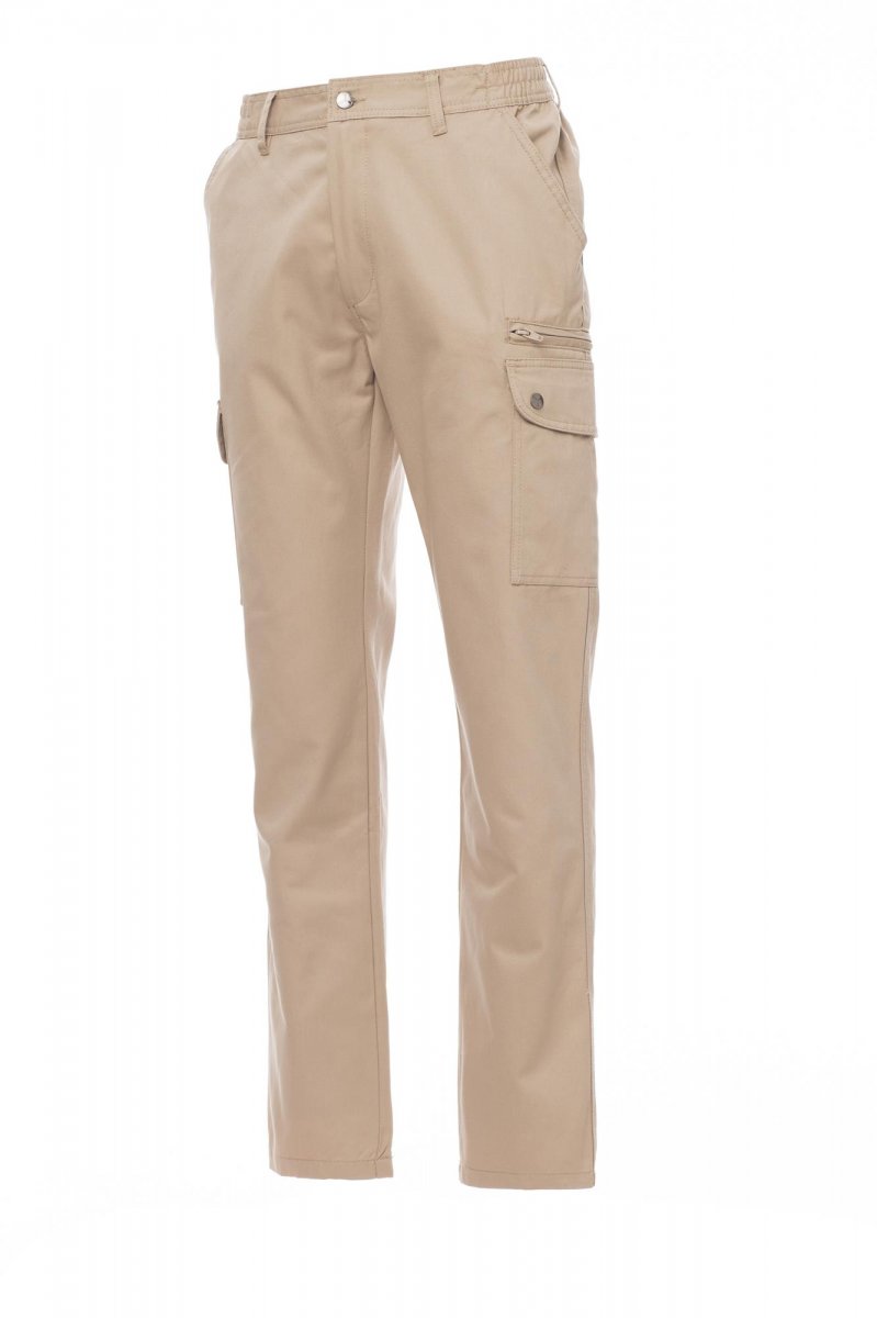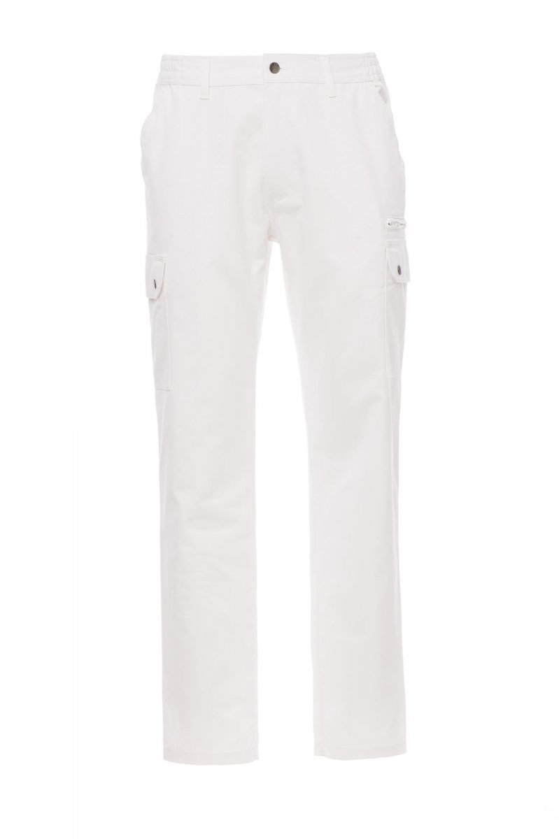 Spodnie męskie całoroczne, z elastycznymi wstawkami bocznymi i szlufkami na pasek. Zapięcie na zamek błyskawiczny z guzikiem metalowym, dwie kieszenie przednie, dwie kieszenie boczne z klapkami i zatrzaskami, jedna kieszeń po lewej stronie z zamkiem błyskawicznym, jedna składana kieszonka na taśmę mierniczą po prawej stronie, dwie kieszenie tylne z rozcięciem poziomym, guzikiem i dziurką.