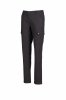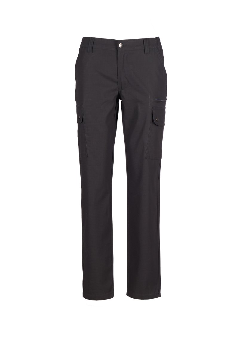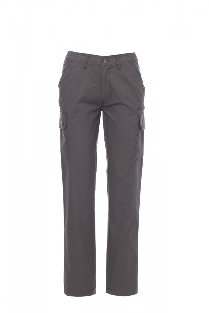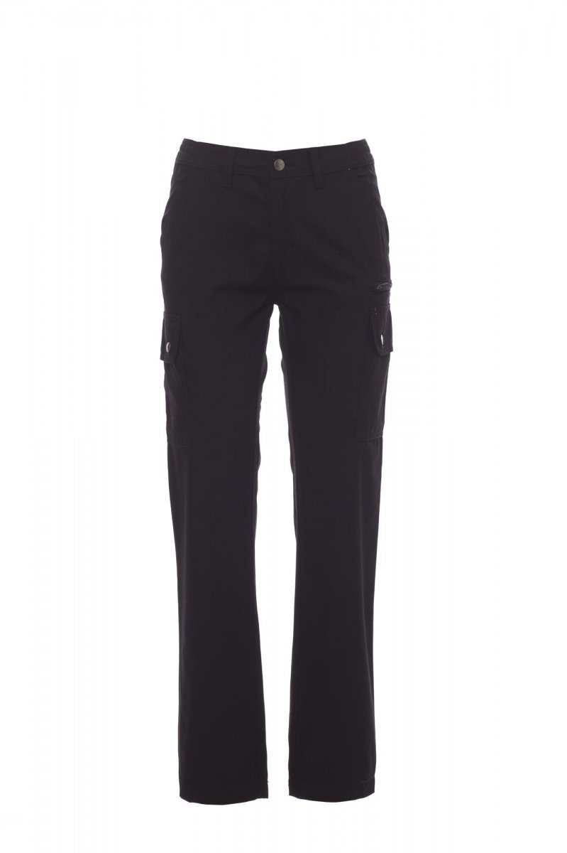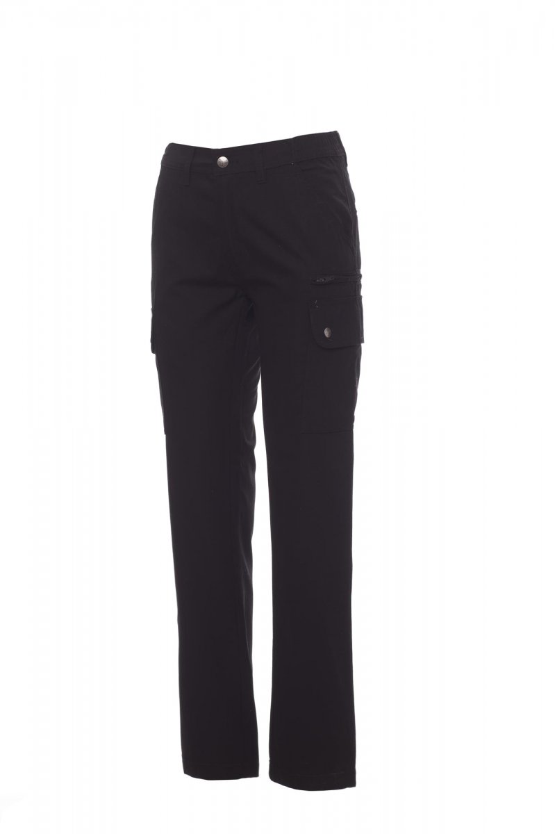 Spodnie damskie klasyczne letnie, z elastycznymi wstawkami bocznymi i szlufkami na pasek. Zapięcie na zamek błyskawiczny z guzikiem metalowym, dwie kieszenie przednie, dwie kieszenie boczne z klapkami i zatrzaskami, jedna kieszeń po lewej stronie z zamkiem błyskawicznym, jedna składana kieszonka na taśmę mierniczą po prawej stronie, dwie kieszenie tylne z rozcięciem poziomym, guzikiem i dziurką.