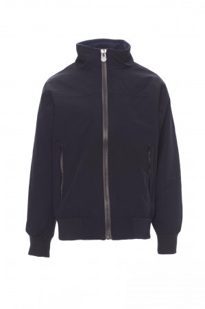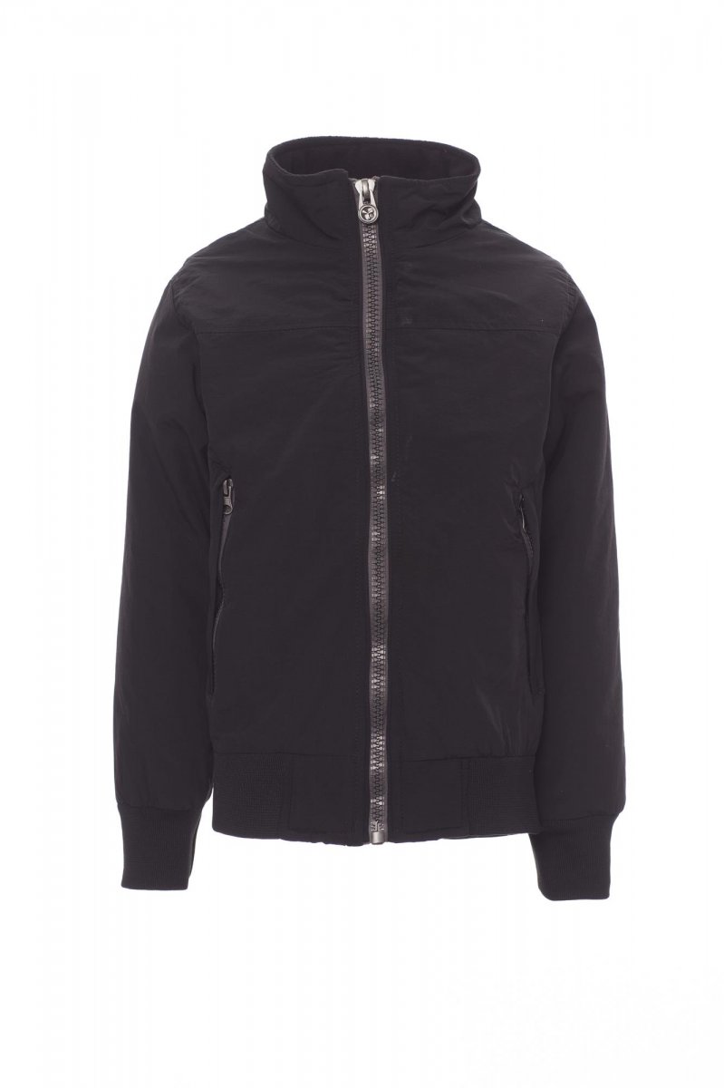 Blusão de criança, fecho de correr de 8 mm em plástico e cursor de metal, canelado (rib) elástico no cós e nos punhos, dois bolsos exteriores com fecho de correr oculto. Interior: acolchoado, micro-polar no colarinho e nas costas, um bolso para smartphone com fecho de correr e abertura para passagem de auriculares, fecho de correr no peito e nas costas para facilitar a estampagem ou a aplicação de bordados.